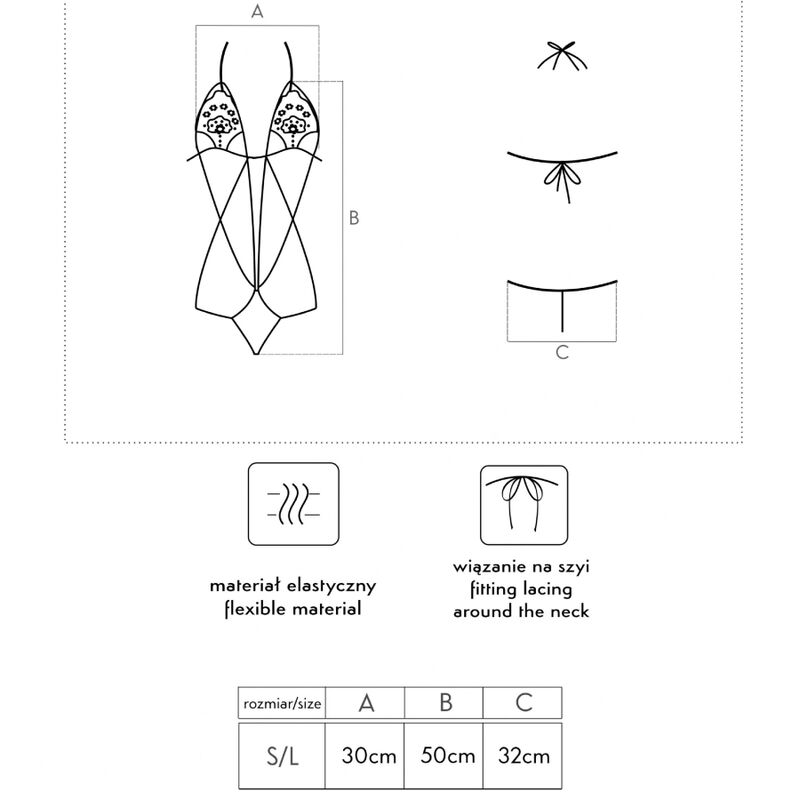 Ein winziger, sinnlicher Body wird Ihre Fantasie beflügeln und den Abend zu einem unvergesslichen Erlebnis machen. Der Body Luisina besteht aus einem zarten Spitzen-BH und einem Tanga mit einem bezaubernden Rosenmotiv. Tanga und BH sind mit einem Gewirr aus Trägern verbunden, das die Taille und die weiblichen Kurven betont. Ein BH, der die Brüste teilweise freigibt und sie gleichzeitig leicht anhebt, verleiht dem gesamten Look eine unglaubliche Note. Die raffiniert angeordneten Träger, die zwischen den Brüsten zum Tanga hinabfließen, stilisieren die Figur optisch. Die praktisch freiliegenden Hüften und Schultern sowie der Tanga sind mit einem Spitzen-Bralette geschmückt. Ebenso wie der Rücken und das Gesäß, die nur mit einem Tanga-Träger und zwei Trägern verziert sind, ist dies ein gewagtes Unterfangen für sie.